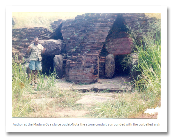 The calculations for the sluice for Maduru Oya by the present day engineers were exact to those of the ancient designer. The Maduru Oya sluice was located with its granite  conduits intact in the 1970’s when the new scheme commenced. The brickwork above each conduit in the form of a corbelled arch  distributed the load on to the walls on either side of the conduit reducing the stresses. This thick brickwork also acted as a defence against any seepage that would erode the fill material in the dam bringing destruction. This may have been the best possible solution to cope with the type of fill material they had to work with.
